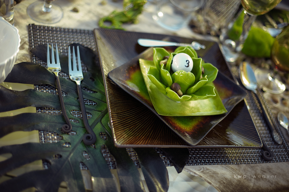 Photographer Kristen Weaver sent us this stunning styled inspirational photo shoot entitled The Greenhouse Effect. A selection of fantastic Orlando, FL wedding professionals collaborated to style and produce this green wedding photo shoot, featuring spectacular details in a palette of earthy greens and browns combined with crisp white, as styled by April Dorsey of The D-Tales. Photographed on locaction at a hydroponic greenhouse on the roof of the Roper Garden Building, Lee Forrest Design used carnivorous plants in the florals in addition to moss, orchids, artichokes and kale. Don't miss the cascading artichoke bouquet, the moss carpet or the million tabletop details, including jeweled tarantulas, porcelain cabbages, green glassware, bamboo-inspired china and wrought-iron flatware. We love the cake with airbrushed metallic detailing, accented by an artichoke, braided palm leaves and wiring created by Anna Cakes. To see more of The Greenhouse Effect, visit the Kristen Weaver blog for more images and a behind the scenes video shot by Cinematique Films.Credits: